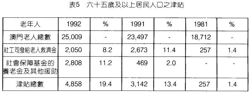 獲發津貼的老年人的百份比由一九八一年的1.4%增至一九九一年的13.4%及至一九九二年的19.4%。(表5)