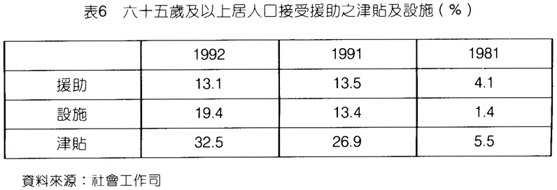 受社會設施、津貼及養老金援助的老年人總數由一九八一年的5.4%增至一九九二年的32.5%。(表6)