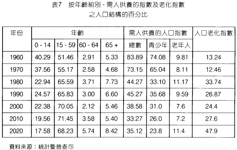 但是,我們亦明白到目前還需作更大的努力,以應付二零零零年及二零二零年老年人口所需求的服務。在那時候,老年人將分別佔總人口的5.5%及8.4%。同時,在二零二零年,人口老化指數達47.9,意味著每一百個在零至十四歲的人中,預計就有五十個老年人。(表7)