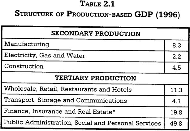 The production structure of Macau can be characterized as unbalanced and highly concentrated. In 1996, primary production accounted for less than 0.1 percent of Macau's GDP; secondary production 15.1 percent; and tertiary production 84.9 percent (Table 2.1). Likewise, other measures such as employment and export shares indicate the prominent importance of tertiary production in the Macau economy.