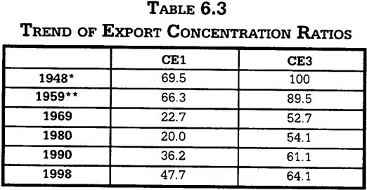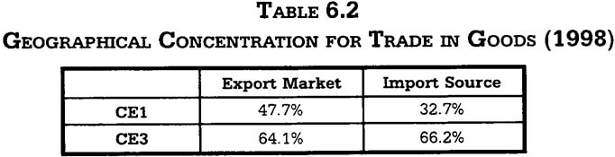 Macau's trade sector is highly concentrated in both the geographical and product aspects. The geographical concentration is indicated by the topone and top-three concentration ratios (CE1 and CE3) in Table 6.2, which are the shares of the single largest and the top three largest export markets and import sources. By world standards, Macau's ratios are at the high end.5