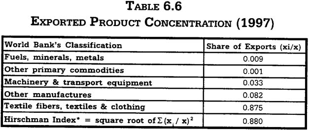 where nis the number of product groups. Following the World Bank classification, the number of product groups is set at five. The lowest value would then be about 0.45, and represents the case of equal division across all five groups.Macau's Hirschman Index, at 0.88 in 1997, indicates a high degree of concentration by international standards.6