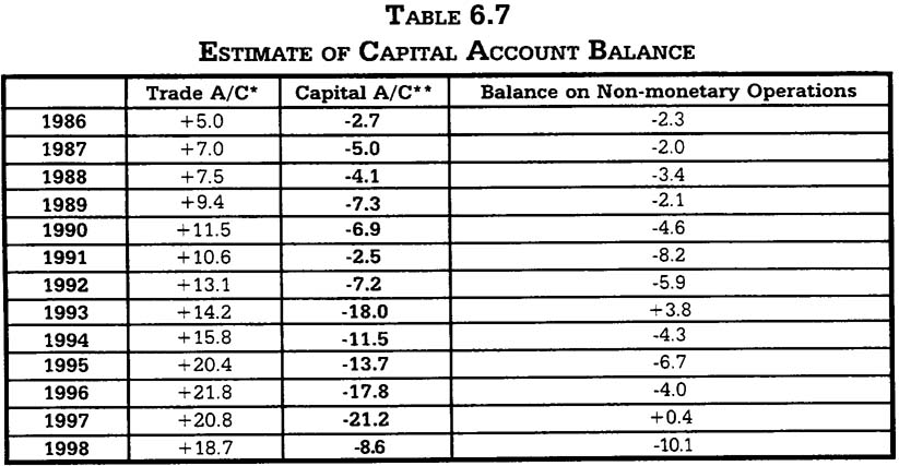 A rough estimate of Macau's capital account of BOP, by the monetary authorities, reveals that the Territory is basically a capital exporter (Table 6.7).It is evidenced by a consistent increase in net foreign assets of the monetary authorities and the banking system, and a consistent trade surplus. The persistent capital account deficit (i.e. capital outflows) highlights the fundamental problem that Macau does not provide enough investment opportunities not only for outside investors, but also for local investors.