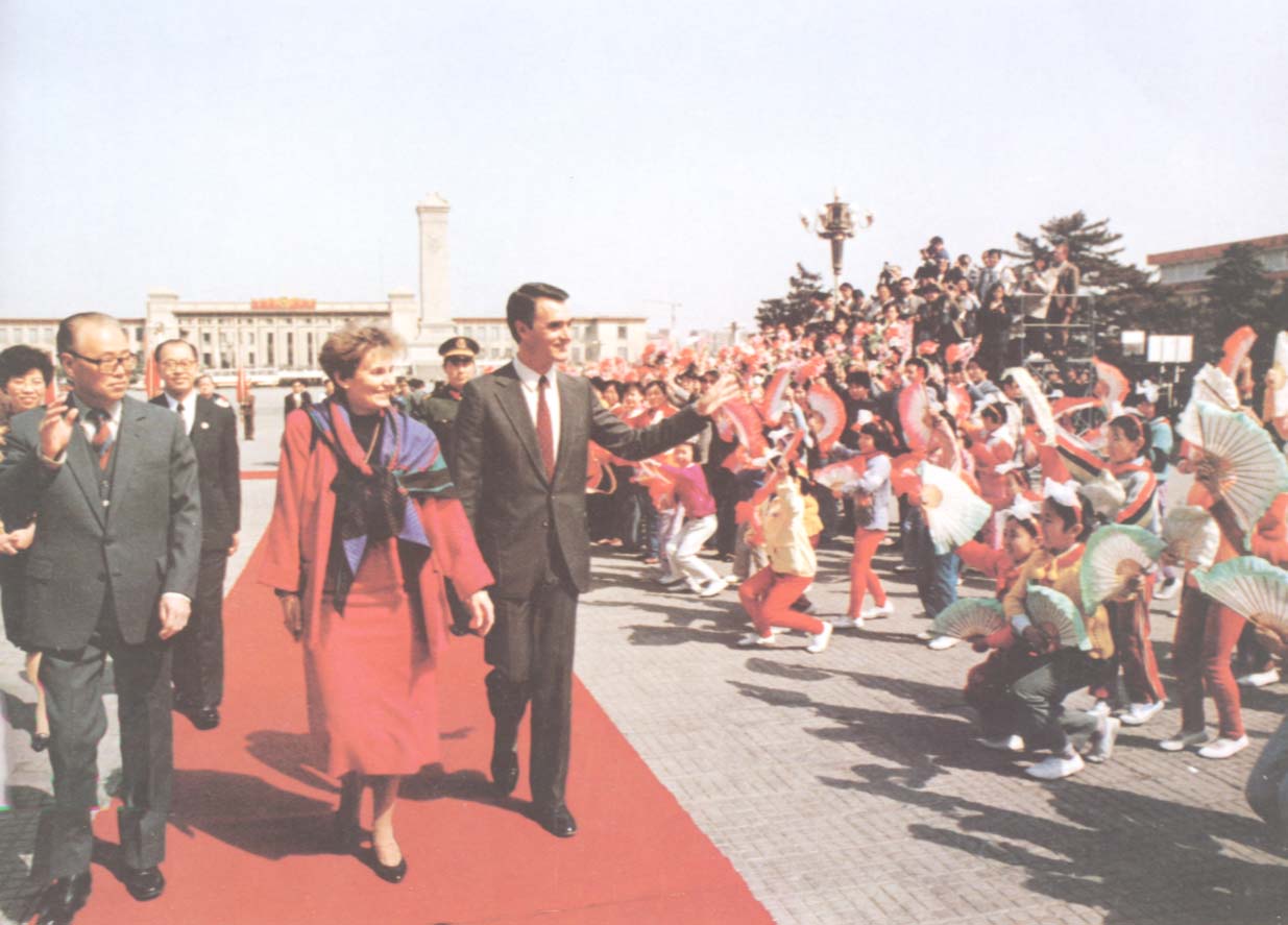 O primeiro-ministro português Cavaco Silva e o ministro dos negócios estrangeiros Pedro Pires de Miranda recebidos no Aeroporto Beijing pelo ministro de negócios e relações económicas exteriores da China Zheng Tobin e o vice-ministro de Assuntos Exteriores Zhou Nan.