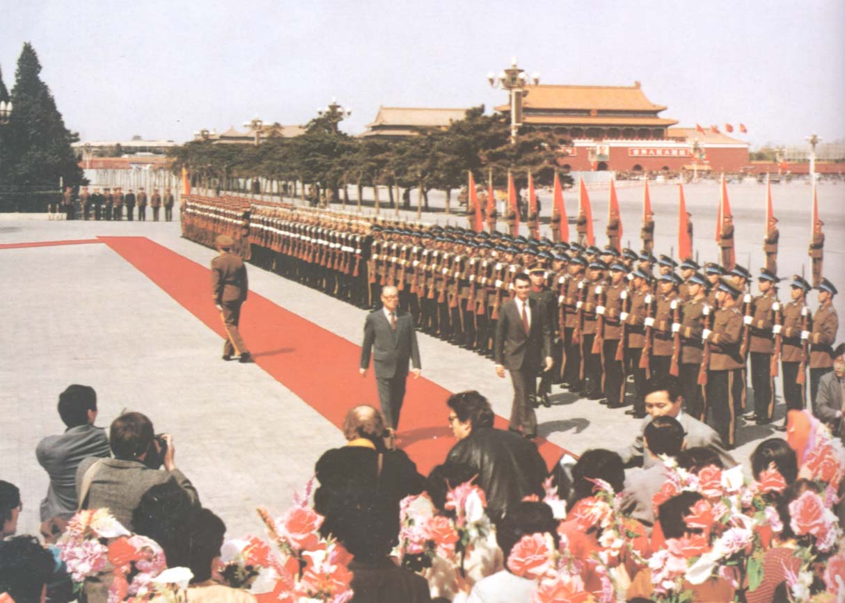 O primeiro-ministro Zhao Ziyang e o primeiro-ministro Cavaco Silva passam revista à guarda de honra.
