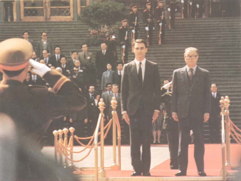 在歡迎儀式上,席爾瓦總理在趙紫陽總理陪同下檢閱儀仗隊。