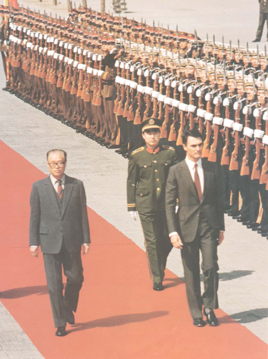 Na cerimónia protocolar o primeiro-ministro Anibal Cavaco Silva,acompanhado do primeiro-ministro Zhao Ziyang,passa revista à guarda de honra.