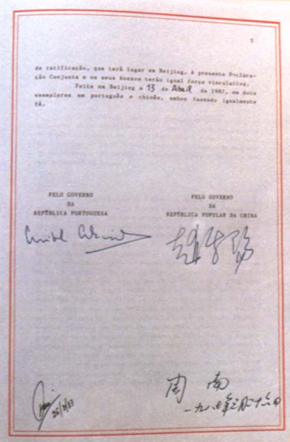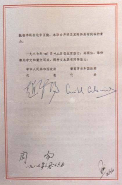O exemplar assinado da declaração conjunta chino-portuguesa depositado em Portugal,na parte infer ior do qual se vêem as rubricas dos chefes das dele9ações negociadoras dos dois países.
