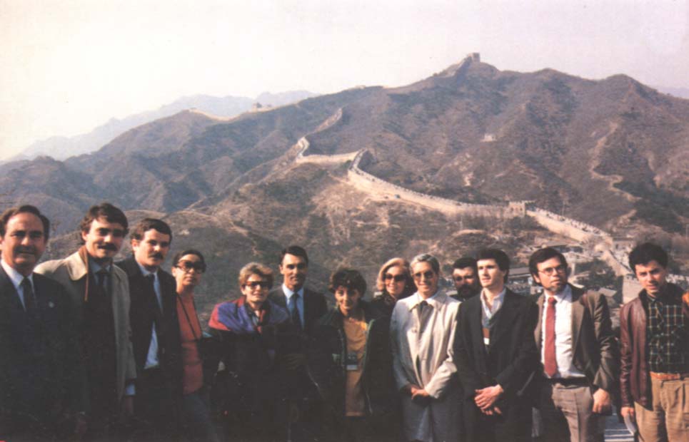 O primeiro-ministro Cavaco Silva e os jornalistas portugueses fotografados na Grande Muralha.