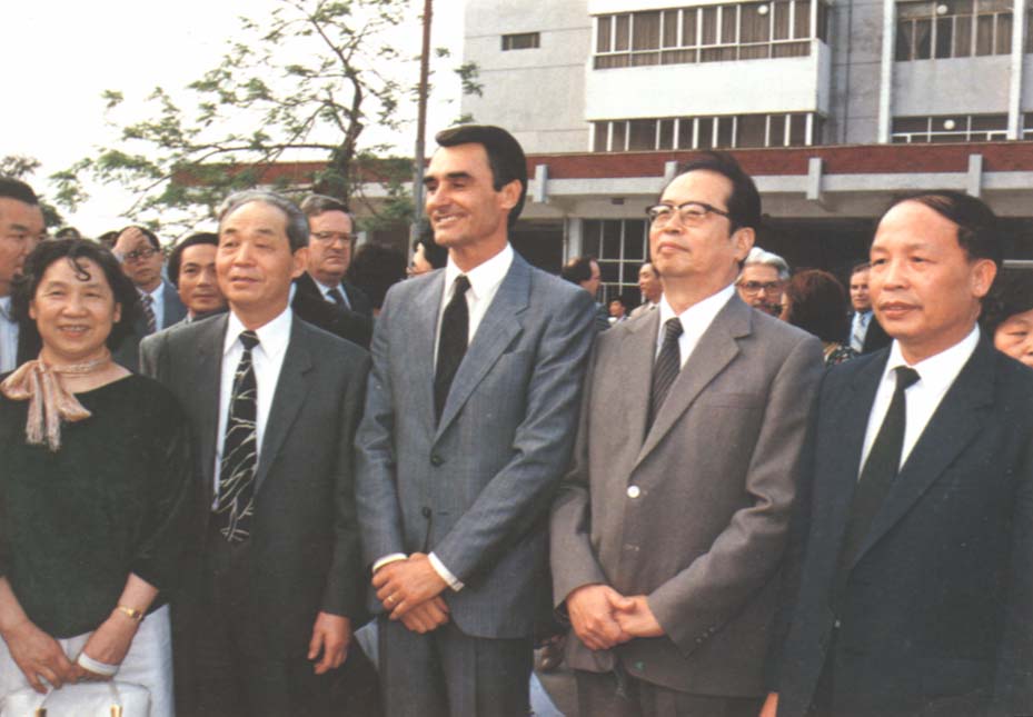 O primeiro-ministro Cavaco Silva,acompanhado do vice-ministro Zhou Nan e o Presidente da Câmarada cidade Zhuhai Liang Guangda,posam para a fotografia diante do prédio da Alfândega de Gongbei ao terminar a visita à China.