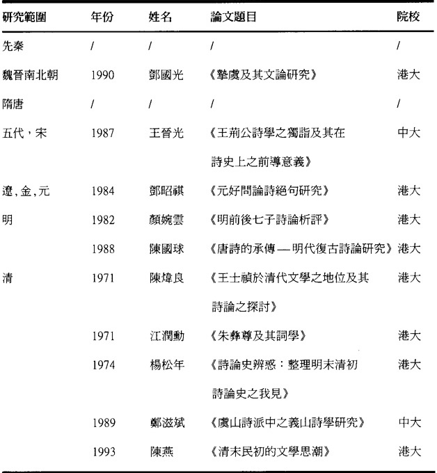 六七十年代無疑是新舊交替的時期,偵得注意的,是本地開始古代文論的博士研究。為清眉目,下表列敘七十年代初至一九九五年香港的博士論香港歷屆古代文論研究博士論文表