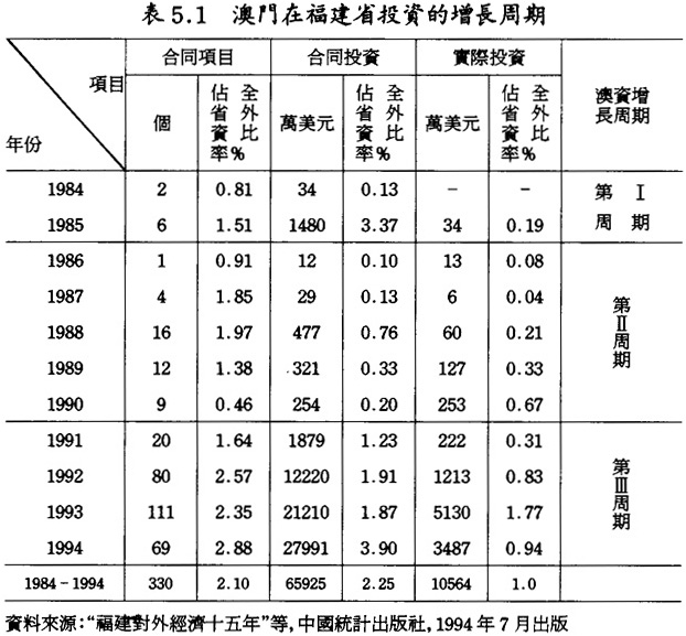 (一)高速增長時期(1984-1985年)。1983年以後,爲了加速經濟發展,解決經濟發展過程中出現的資金短缺問題,大陸在總結經驗敎訓和統一認識的基礎上,進一步放寬了對外商投資的政策限制。爲此,國務院先後採取措施,開放了沿海城市,下放了外商投資審批權限、實行減免稅優惠以及讓渡一定市場等政策,強化了吸資、引資的政策力度。此外,外資立法工作也逐步走向完善化,從法律上保障了外商投資的合法權益,進而調動了澳商來閩投資設廠的積極性。與此同時,澳門經濟經過60年代中期至80年代初期的快速增長,經濟總量大幅度提高,產業結構逐步邁向高級化,澳門工業的經濟地位也進一步加強,已佔到國民生產總値1/3左右,成爲第一大產業。尤其是旅遊博彩業、出口加工業、銀行保險業和地產建築業四大經濟支柱的形成和強化,擴大了澳門對外經濟活動的空間,促進對外貿易的迅速發展,由此積累了相當雄厚的資金,具備了對外投資的實際能力和客觀條件。另一方面,隨着經濟的快速增長,澳門工業賴以生存的工資成本優勢急劇提高,出口工業尤其是紡織、成衣和玩具業等一些勞動密集型產業的比較優勢地位日趨下降,也急需通過對外投資轉移要素資源,借此重新獲得產業發展的新空間,以延長產品生產的生命周期。大陸與澳門在地域上聯結成片,語言相通,習俗相近,經濟關係一向密切。這種區位優勢的催化,大陸尤其是珠江三角洲地區自然成爲澳商選擇投資置業最便利的地方。福建籍的澳門鄕親佔澳門人口1/5,經過十幾年來的發展、壯大,不少人已事業有成。在這種條件下,一些閩籍澳商開始了對閩投資的試探過程。1984年澳門對福建省的投資僅2項,合同金額爲34萬美元;1985年澳門對閩投資增至6項,合同金額增至1480萬美元,較上年同期分別增加3倍和43.5倍,單項投資平均額也增加14.5倍,高達246.7萬美元,這是當年外商對閩投資平均規模的3倍多。