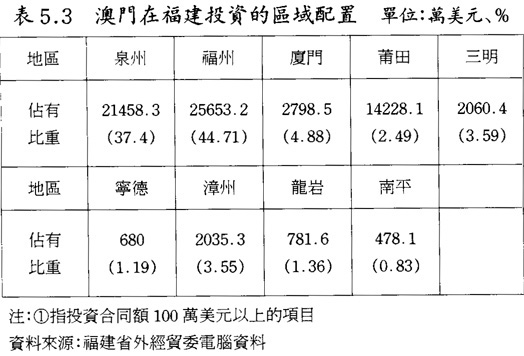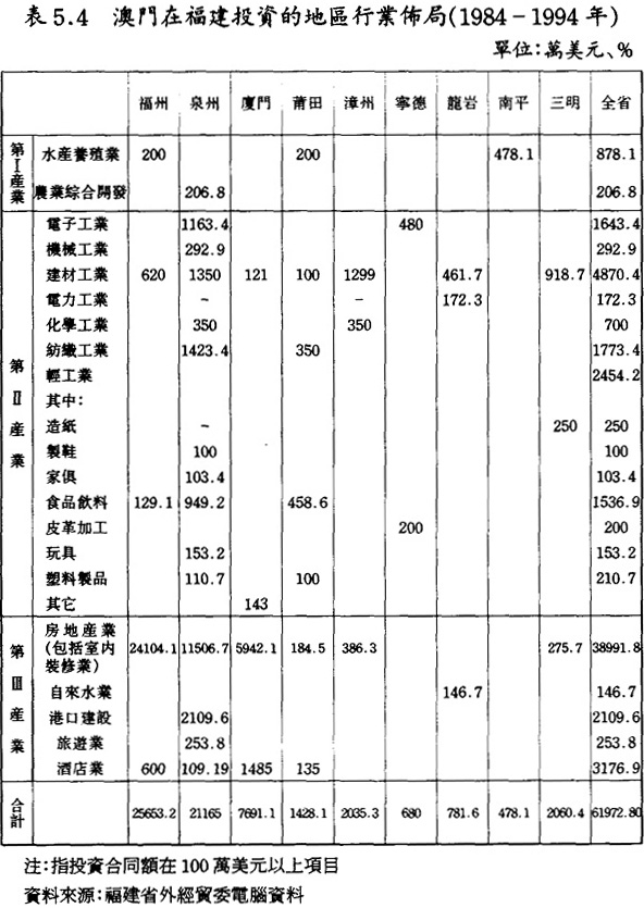 其次,從地區分佈看,澳門在福建省的投資主要集中在閩東南沿海地區,其中以泉州、福州兩市為主,它們的投資額佔80%以上。以投資百萬美元以上的項目爲例,截至1994年,澳門在福建省投資的區域配置爲:福州市的協議投資額爲2.56億美元,佔44.71%,居首位;泉州市的協議投資額爲2.15億美元,佔37.4%,位居第二。隨後分別是三明市(佔3.59%)、漳州市(佔3.55%)、莆田市(佔2.49%)、龍岩市(佔1.39%)和南平市(佔0.83%)(如表5.3所示)。另據筆者調查,在1995年1至7月份,澳門在福建省閩東南沿海一帶的投資有14家,其中泉州和莆田兩市各佔6家,廈門市和漳州市各1家。與去年同期相比,澳門在福建省的直接投資項目數和金額數均呈大幅下降,降幅有的高達一倍以上。這與福建省同期外商投資協議額有所回落的趨向基本一致,祇不過澳門投資的回落速度和金額較爲突出,而且同福建省目前外商投資到資率有較大提高相反,從而促成人們更多地對澳門資本的實際投資能力和發展前景產生一定的疑慮。福建省在澳門的投資集中於半島,其業務雖拓展至氹仔、路環一帶,但佔有的比重仍很低,甚至出現進一步萎縮的境地。近年來,澳門對福建省的投資有出現北上和內移的勢頭,原因主要是閩東南沿海一帶的外資投入趨於相對飽和,並對外商的投資行業有所選擇。若要進入閩東南一帶,獲得進一步的發展,需要借助集團的力量推動,否則,是難以取得競爭優勢的。這對以中小企業爲主的澳門資本來說,顯然是個不利的信息。同時,福建省的北部和內陸地區的自然資源異常豐富,急需通過引資加速開發,使潛在的資源優勢變爲經濟優勢。同時,隨着通訊設備、交通運輸條件的相應改善,基礎設施的“瓶頸”地位得到一定程度的緩解,一些行業如電力、水產養殖和建材業等對澳門資本有較強的吸引力。而且,從近幾年的投資實踐看,澳門在福建內地的投資獲得較爲豐厚的利潤報酬,也增強了他們進一步投資設廠的信心。今年來,福建省按照“中央經濟工作會議”的有關精神,正努力減弱沿海地區與內地的經濟發展差距,並採取相應措施扶持內地企業發展,促進要素資源尤其是資本和技術逐步內移。這種趨勢也將增強內地對澳門資本投資的吸引力,估計在近些年內,澳門資本在福建省內陸地區的投資將得到較快的發展。