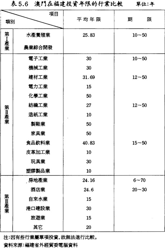 第五,從投資年限看,澳門投資以中長期為主。據統計,截至1994年,在澳門投資百萬美元以上項目中,平均投資期限爲25.83 年,屬於中期投資。但在不同行業,投資年限有很大的不同。其中房地產投資年限在6年至70年之間,平均年限爲24.16年;食品飲料業的平均年限爲40.80年;酒店業24.6年;紡織業27年;建材業31.69年;水產養殖業25.83年;電力工業30年(如表5.6所示)。從投資方式看,獨資企業爲29.35年;合資、合作企業爲28.34年,彼此間僅相差一年,有較高的相似性。應該說,上述產業的投資期限基本合理,同產業發展的生產周期有較強的相關性。但一些行業投資年限過長,如有的房地產開發期限長至70年,則與大陸規定的政策有悖,也不利於地產市場有序發展的長遠要求,這種現象應在今後工作中加以避免。否則,同一行業經營期限懸殊過大,有礙於公平競爭,對建立規範有序的社會主義市場經濟體制也是不利的。