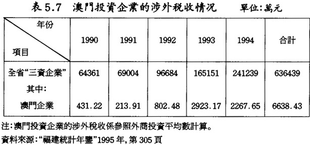 外商投資的財政效益指的是外商投資產生的淨效益,用公式可表示爲:外商投資淨效益=外商投資直接效益與間接效益之和-外商投資的直接成本與間接成本之和。從理論上說,外商投資直接效益包括各種涉外稅收收益;外資企業支付的基礎設施服務費扣除工資成本後的餘額;合資企業的中方稅後股息、紅利;外資企業償付的國內銀行貸款本息。直接成本包括爲外資企業服務的基礎設施配套投資;土地批租的機會成本;合資(合作)企業的中方財產拆資和自有資金投入;以及國內銀行對外資企業的貸款和中方的財產損失。間接效益包括向外資企業提供原材料、設備以及基礎設施以外的各類服務引起的國內企業稅利增加;外資企業帶動的購買力提高促成國內消費品生產企業和服務性企業的稅利增加。間接成本包括國內企業因與外商合營享受稅惠造成稅入減少;外資企業產品擠佔市場導致部分國內企業稅利減少;外資企業間接享受的財政補貼和福利;外商投資引起的各種補貼、津貼增加和因“三廢”排放提高了地方的環保支出。事實上,上述指標有些可以相互抵銷,有些在外商取得土地使用權時就已部分或全部(如基礎設施配套投資)攤入成本。加之涉及項目繁多,統計資料不易取得,在此祇作粗略估算。據統計,1990-1994年間,澳商投資企業的各種稅收收入累計爲6638.43萬元,約佔同期外商對福建省投資的稅收收入總額1.04%。近年來,澳商投資企業的稅收收入增加較快,1993年高達近3000萬元,是前些年平均稅收收入的幾倍甚至十多倍,表明澳商投資已進入相對成熟的發展時期,如表5.7所示。同期,福建省在澳門投資企業也迅速發展,各種稅收上繳也急劇增加。以澳門國際銀行爲例,1992年上繳的稅項爲765.2萬澳門元,1993年增至908.5萬澳門元,1994年更高達992萬澳門元,年平均增長率爲9.06%①,財政效益相當可觀。