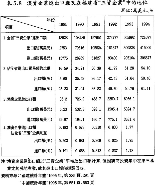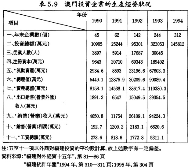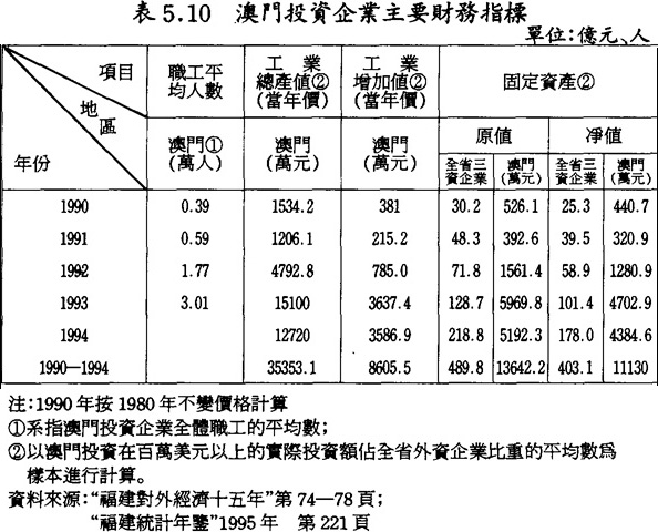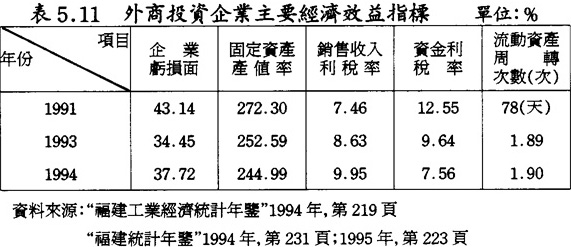由表5.10可知,1990-1994年間,澳門在福建省第二產業投資形成的總產値、增加値及固定資產原値、淨値的年平均增長率均在50%以上,表明澳門投資企業已進入快速增長階段。從澳門投資企業的經濟效益看,1991-1994年間,澳門企業的虧損面已有所下降。據筆者調查,目前投產的絕大多數澳資企業已開始出現盈利,其銷售收入利稅率和流動資產周轉次數均有不同程度的提高。由表5.11可以看出,福建省外資企業的虧損面已由1991年43.14%降至1994年37.72%,固定資產產値率和資金利稅率也分別由272.2%、12.5%降至244.99%、7.56%,同期的銷售收入利稅率則由7.46%提高至9.95%,流動資產的周轉次數也相應提高。從比較效益看,近年來福建省外商投資的綜合經濟效益提高較快,大多數企業已達到保本或略有盈餘,這與澳門投資企業的發展趨勢是一致的。外資企業經濟效益的提高,增加了投資者的信心,也是近年來澳商對閩投資急劇增加的具體反映。