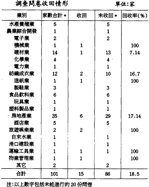 問卷共發出101份,扣除因地址更改無法追查、倒閉和停業退回15份,剛設立的5家企業無法回答外,實際發卷81份,回收15 份,回收率爲18.5%。在回收問卷中,機械製造業1家、紡織成衣業2家、運輸工具業1家、造紙業1家、房地產業6家、建材業1 家、旅遊業1家、娛樂業1家。