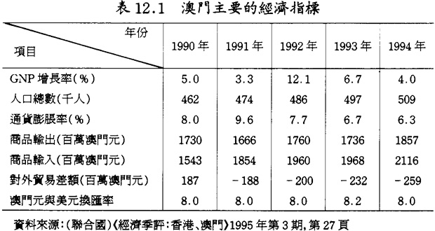 近兩年來,澳門經濟增長差強人意,主要是由客觀環境造成的。目前澳門經濟狀態有所改善,經濟增長率保持在6%左右,一些先行指標的回升勢頭持續穩健。一是對外貿易有較大增長,1995年第一季度的進出口貿易額較上年同期分別增長3.5%和10.4%。二是通貨膨脹率降低,已由1991年的9.6%降至1993年6.7%和1994年6.25%。三是旅遊業恢復發展。酒店房間入住率提高,1994年入住率較1993年增加7個百分點,其中日本旅客住房率上升10.3%,泰國增加12.6%,美國增加22.8%,大陸增加11.8%。四是地產建築業一路滑坡勢頭得到一定的抑制。雖然1994年新建和擴建樓房項目有較大下降,但新動工樓房數目和總建築面積均有提高,增長率分別達到17.1%和38.1%。五是貨幣供應進一步松動。1994年澳門貨幣供應M1指標雖有降低,但M2指標增長幅度較大。①可見,澳門經濟已經或正在擺脫增長的陰影,處在較快的復蘇之中,估計再經過一、二年時間,澳門經濟將進入全面振興階段。
