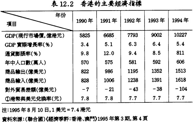 事實上,臨近“九·七”的香港仍是跨國公司在亞洲首選的地區之一。據香港工業署不久前的調查,目前共有2068家海外公司在香港開設辦事處,其中包括782家地區總部和1286家地區辦事處。這些數字高於1994年,表明香港在亞太地區的中心作用在不斷地加強。在香港開設的地區總部的公司中,以美國企業最多,其次是日本和英國公司。近年來,香港經濟溫和增長,通貨膨脹率較快下降,對外貿易迅速發展,港元的對外兌換率增強等〔如表12.2所示〕,表明香港經濟的內部環境趨好,對澳門經濟有較強的帶動作用,有利於澳閩雙邊經濟關係的進一步發展。
