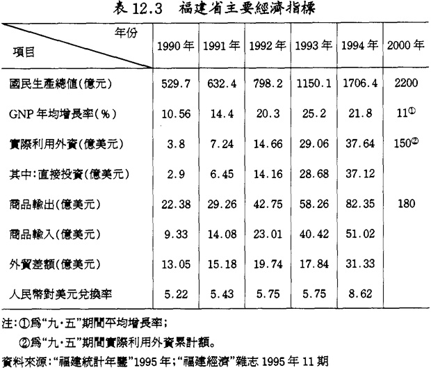 第三,福建經濟正處於初級工業化之後的加速發展時期。經過“八五”期間的努力,福建經濟已從低收入階段走向中等收入發展階段,各項基礎設施的初步完備以及社會主義市場經濟機制的逐漸確立,爲“九五”期間福建經濟的騰飛奠定了基礎。按1990年不變價計算,到2000年福建國民生產總値將達到2220億元,其中外貿出口年平均增長率15%,至2000年達到180億美元(實際爭取達到200億美元);實際利用外資累計爲150億美元。三次產業結構將從1994年的22.1∶43.9∶34調整爲15∶47∶38,科技進步對經濟增長貢獻率增至50%。從而,爲至2010年的經濟持續快速增長提供了保證,如表12.3所示。