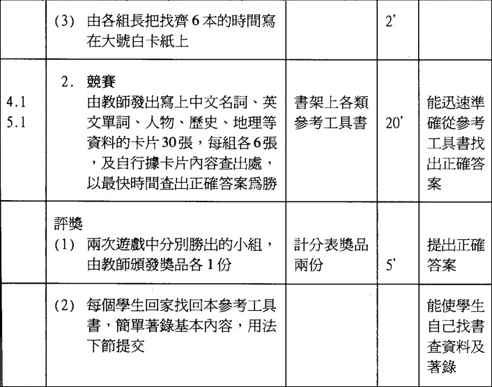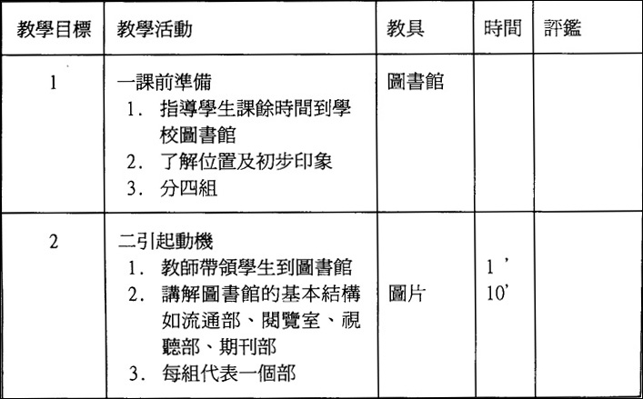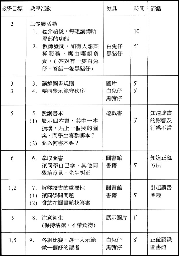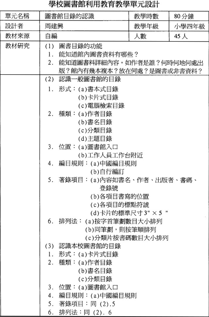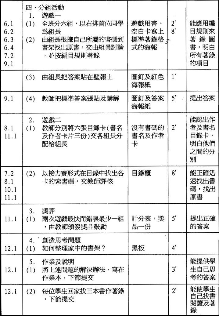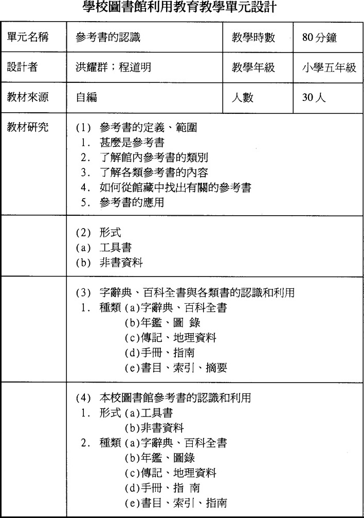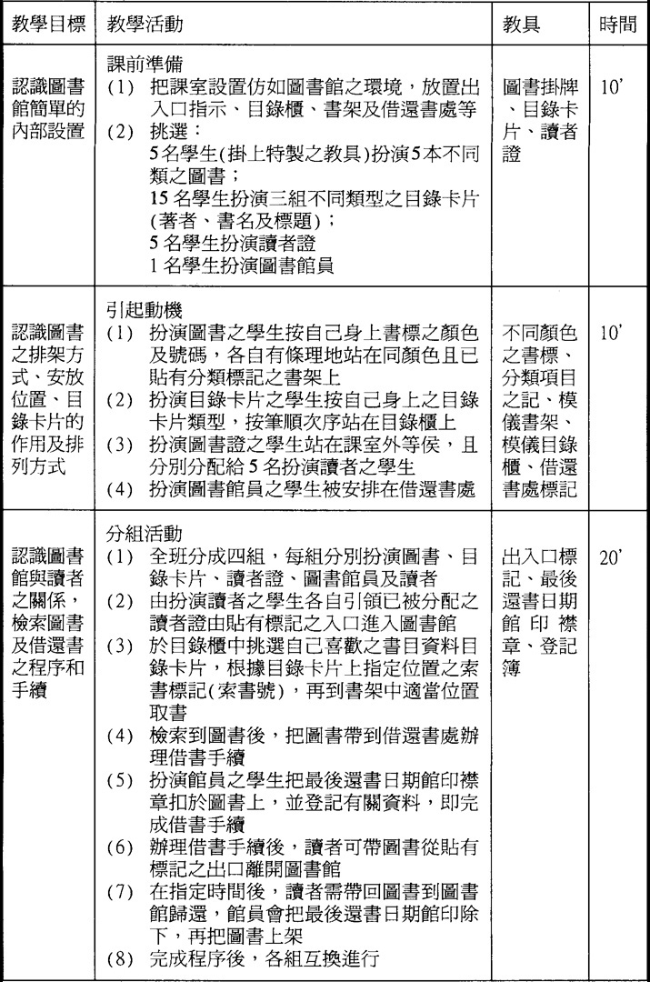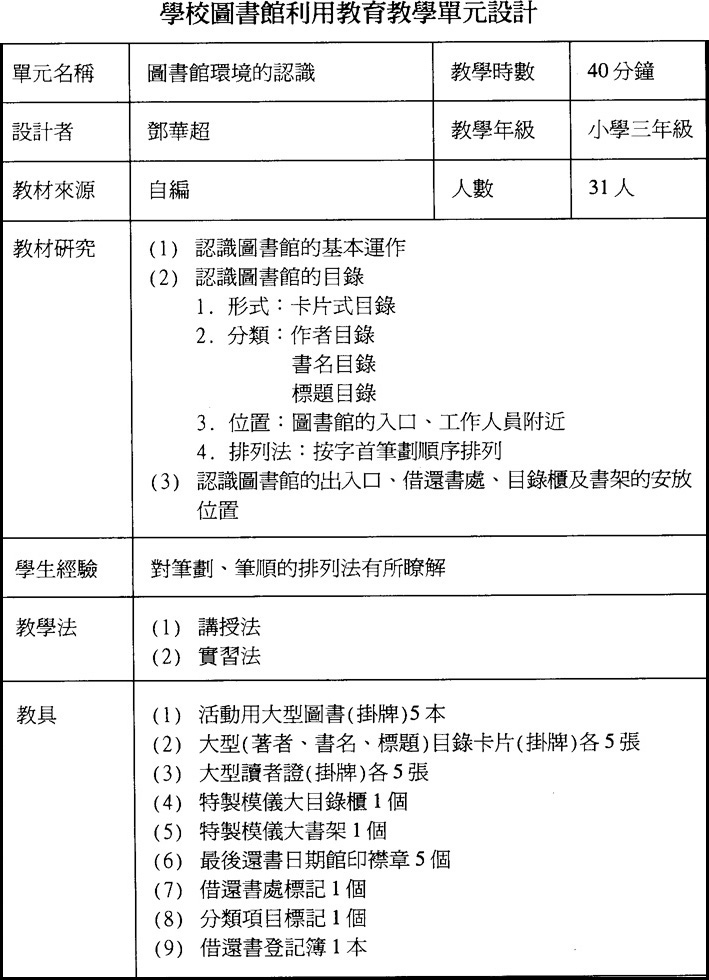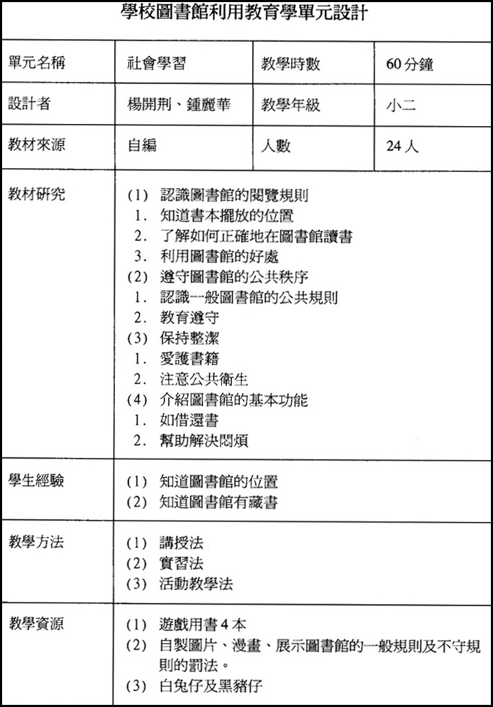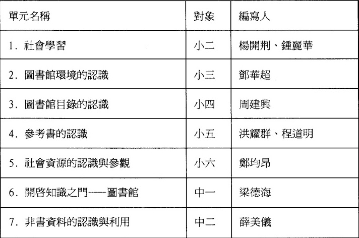 本節輯錄了澳門圖協在1996年與澳門大學合辦的“圖書館學專業文憑課程”中部份學員的作品,共計七個教學單元設訐的例子,教學對象由小學二年級至中學二年級,其單元的名稱及內容說明如下: