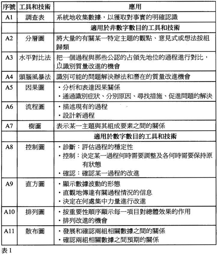 進行全面質量管理,必須運用一些方法,找出問題的根源,從而改進產品與服務,利用質量管理的工具和技術,收集信息,並硏究和分析,最後作出決策,達到改進質量與服務的目的。以下表摘自劉大明的《ISO9000與質量改進》,廣東人民出版社,1996年。(參見《中華人民共和國國家標準》GB/T19004.4-1994)