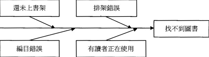 在圖書館常發生的事,讀者找不到圖書館有的書籍,而該書又沒有被借出,必須找出原因,可用因果圖作分析: