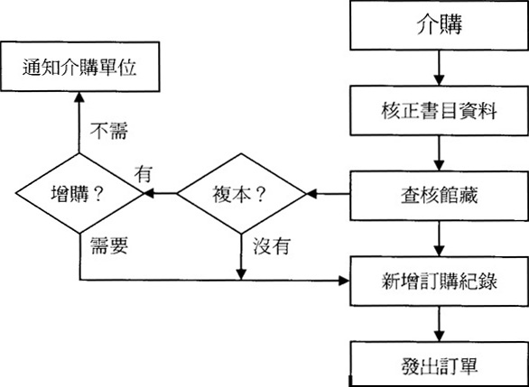 圖書館採購工作,爲避免重複購買,必須按一定流程進行,圖示如下: