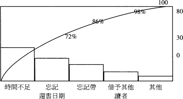 圖書館可用排列圖表示讀者過期還書的原因。由於發覺最主要是沒有足夠時間閱讀,可考慮延長借書期限,改進服務: