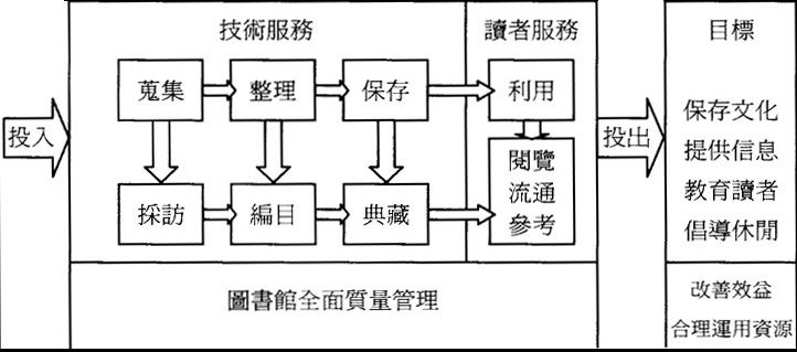 質量管理的工具和技術可以支持圖書館全面質量管理工作流程,協助團隊和管理者把問題的徵結找出。圖書館可按各自情況運用上述各種工具和技術,協助管理工作,務求把圖書館做得更好。下圖可說明圖書館各部門的運作關係和最終任務: