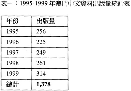澳門爲遠東最早利用印刷術來出版書刊的地區,自1588年Alexandre Valignan。神父在澳門創設澳門印刷所以來,出版不少外文書籍,17-18世紀之間因葡萄牙禁止海外省自行出版圖書,迫使澳門的出版事業陷於低潮,至於早期澳門出版的中文資料,主要爲天主教傳教士聘請中國刻版工人在澳門印刷的教義書,目前最早一部印製的中文古籍,推算爲羅明堅神父印製的“天主實錄”(1584年)。但由於明淸政府極力禁止洋人在澳門出版書刊,扼殺了澳門的中文出版業,於是傳教士祗得把出版基地移往其他中國的城市,包括肇慶、廣州、上海、北京等地出版。到了本世紀,澳門的出版業出現了三次高峰期,第一次在三十年代末至五十年代初,由於澳門爲中立港,在中日戰爭及國共內戰期間,不少國內學校與知識份子均暫時避遷到澳門,此時有不少校刊,政治宣傳刊物,文學專書在澳門出版,其數量仍在調查中,目前已知最少有三百多種。第二個高峰期爲七十年代末至八十年代初,澳門隨著中國政策漸漸開放,加上港台對中國大陸學術著作有所需求,而且澳門早年的慈幼中學設有印刷科,那時澳門的印刷技術還比香港高,工資低廉,故此有不少香港書商到澳門來印刷書刊,甚至出版翻版書運往香港及東南亞一帶銷售。第三次峰期爲1993 年至今,澳門的澳門基金會、文化司署、東方基金會等多個單位,熱心推動澳門的出版事業,以各種形式贊助本地作者出版大量以澳門爲題的著作,總訐目前澳門出版的圖書共收集了4,041種,其中近五年出版品數量爲1,305冊,(見表一)佔了36.5%,平均每年出版中文或中葡雙語的資料爲261冊,即每1.36 天便有一本新的中文資料出版。雖然數量不多,但不竟其主題大多以澳門爲主,形成澳門獨有的藏書特色,主要內容以澳門文學、社團及展覽特刊、澳門法律及公共行政、硏討會論文集及中譯葡文文學與歷史作品爲主。