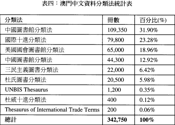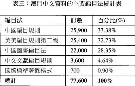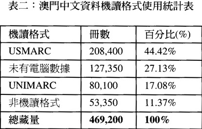 目前澳門圖書館有關中文資料的總藏書量,可從澳門圖書館暨資訊管理協會在1998年12月的澳門圖書館調查中,可得知其輪廓,在98份回答的問卷中顯示,中文資料總藏量約爲469,200冊,佔全澳總藏量58.94%,即近六成的資料,約有341,850冊資料已建入電腦檔,佔中文資料總藏量72.87%,其中採用USMARC來儲存資料的最多,共208,400冊,次爲UNIMARC儲存資料,有80,100冊,合訐288,500冊,以非機讀格式儲存的資料,有53,350冊,佔11.37%,未有輸入數據的書刊計有127,350冊,佔27.13%(見表二),即有六成的書目以機讀格式建檔,可作資料交換之用。以下表三爲澳門中文資料的主要編目法統計表,表四爲中文資料分類法統計表,可作詳細的參考。