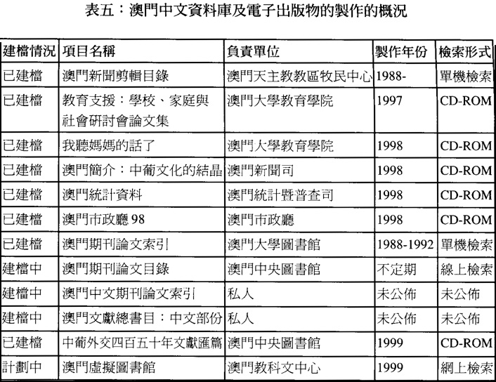 除在傳統的書目建檔工作外,澳門在有限的人力,金錢與設備下,亦嘗試建立一些中文資料庫及電子出版物,至今數量雖然不多,影響未深入,但是由於澳門的地理位置背靠中國大陸,那裡擁有一個廉價而且技術先進的資訊服務產業,故此今年三月澳門成立了第一間數據處理公司,名爲資易數據有限公司,專門製作全文資料庫,並爲澳門中央圖書館成功製作澳門圖書館界首張全文檢索光碟”中葡外交四百五十年文獻匯編"估計在不久將來,澳門圖書館及出版單位,將會透過這途徑,建立大量的全文資料庫或電子出版物。下表爲目前澳門的資料庫及電子出版物的製作的槪況。