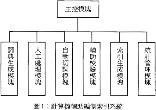 我們開發了一個計算機輔助編制索引的系統[2],整個系統分爲六個模塊,其結構如下(見圖1):