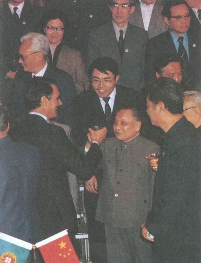 鄧小平與葡萄牙總理席爾瓦舉杯慶賀《中葡聯合聲明》正式簽署。