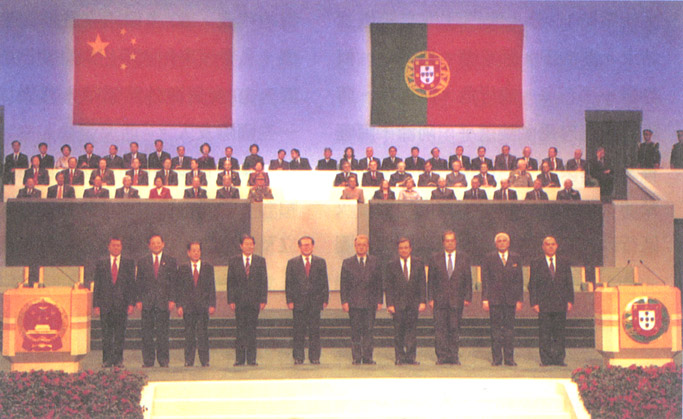 12月19日午夜至20日凌晨,中華人民共和國與葡萄牙共和國在澳門文化中心花園館隆重舉行澳門政權交接儀式。圖為出席政權交接儀式的中葡主要代表合影。
