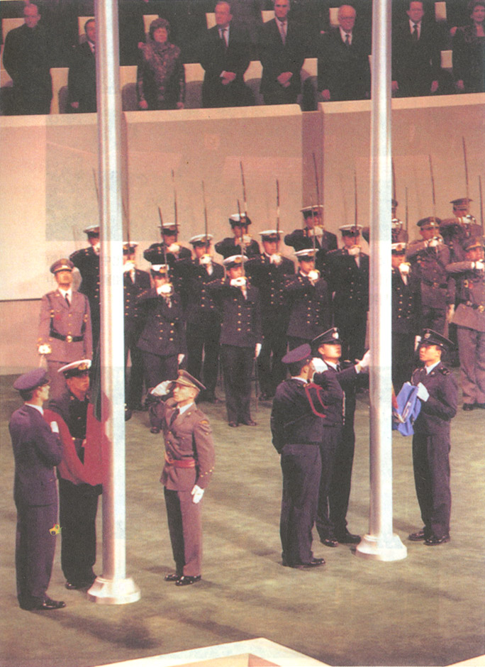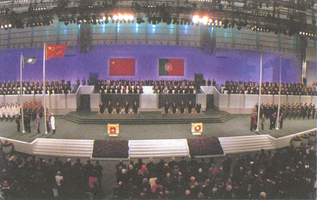 12月19日午夜。中華人民共和國與葡萄牙共和國在澳門文化中心花園館隆重舉行澳門政權交接儀式。中華人民共和國從此開始恢復對澳門行使主權。圖為12月20日零時,中華人民共和國國旗和中華人民共和國澳門特別行政區區旗在交接儀式會場莊嚴升起。