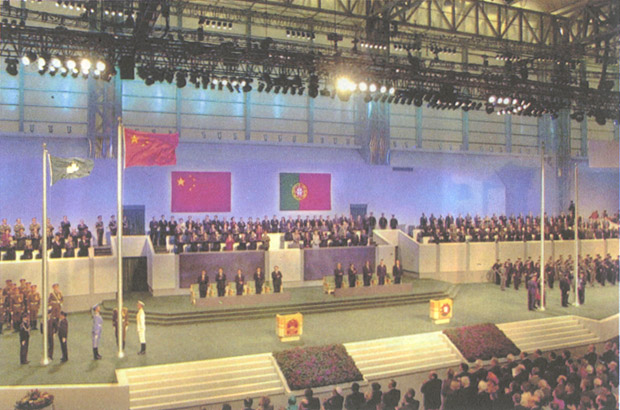 19日深夜,中葡兩國政府在位於澳門新口岸剛建成的澳門文化中心花園館隆重舉行舉世矚目的澳門政權交接儀式。