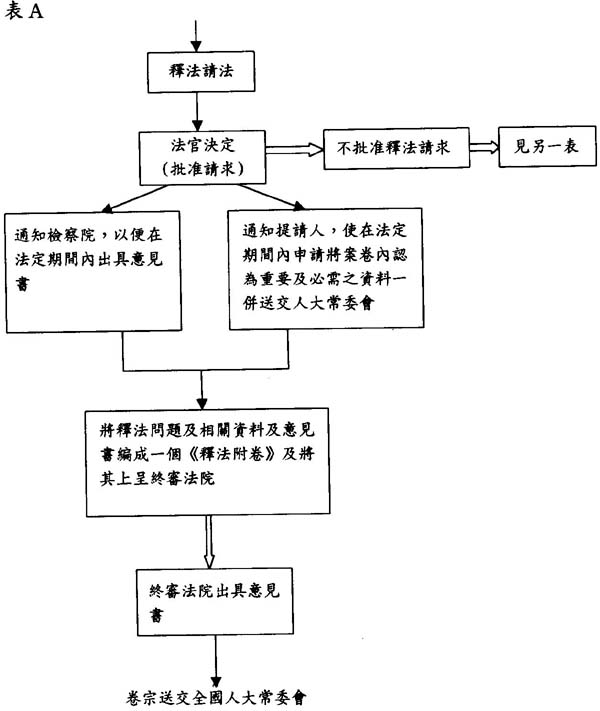 3)終審法院收到申請後,原則上不對實體問題作決定,僅出具附理由說明之意見書(認為符合釋法之要件或不符合),之後將所有材料轉送人大常委,由其作終局決定;
