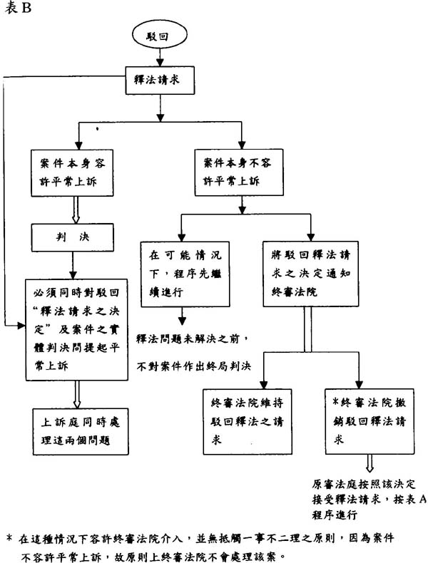 這種立法方案亦有商榷之處,原因我們不主張在司法系統內對釋法之問題設立二級實體審查制度。我們假設:訴訟當事人A向一審法院請求引用反致機制,但法院深入分析有關問題後認為不合第143條之規定,故駁回該請求。按照草案第五條之規定,A可以提起平常上訴。但草案無明文指出是針對案件實體之問題提起上訴,或僅針對“駁回釋法請求”之決定提出上訴。如屬於後者,即時對該決定上訴及將案件移交上訴庭處理?或待審判完結後才將案件移交上訴庭處理?我們認為,對於“駁回釋法請求之決定”當事人或正當性之人可提出上訴,但是否將案件上呈受制於一個條件:當事人對審判結果(判決)不服,即針對實體問題提出上訴,只有在這種情況下,在對實體問題(或程序問題)提起上訴時,可針對“駁回釋法請求之決定”一併提起上訴,否則,如果當事人滿意判決(雖然過程中出現要求釋法之問題),最後無對實體問題提起上訴,則不能僅對釋法問題提起上訴。