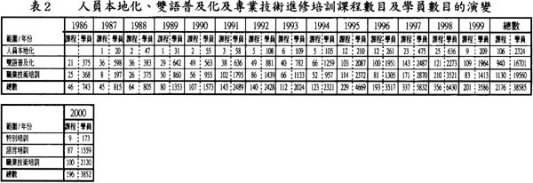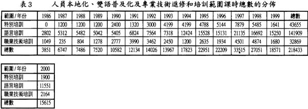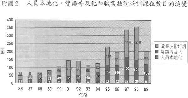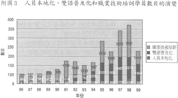 從上圖可看到1986年至1999年期間,在人員本地化、雙語普及化及職業技術培訓三方面的演變情況,以下為值得注意的部份: