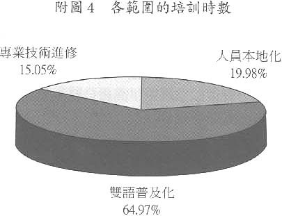 由圖表資料顯示,培訓課時總數為218,433小時,其中雙語普及化方面佔65%,人員本地化方面佔20%,而職業技術培訓方面則佔15%。然而值得關注的是由於課程的特質有異,人員本地化及雙語普及化方面的培訓課程,其課時往往較一般的職業技術方面的培訓課程為多。