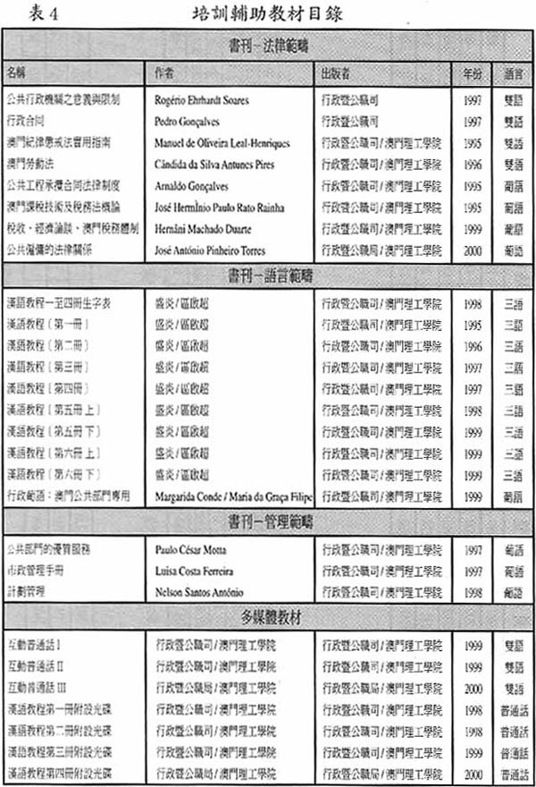 行政暨公職局由1994年開始編製及出版培訓輔助教材,截至2000年,一共出版了21套有關法律、語言及管理範疇的培訓手冊和7套多媒體教材(光碟及唯讀光碟)。大部份的教材均與澳門理工學院共同出版。