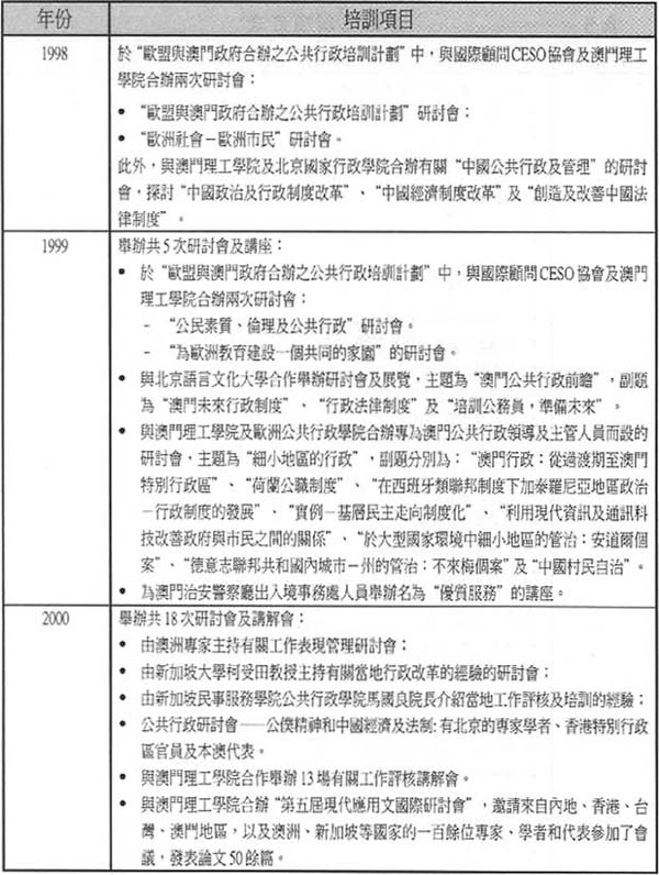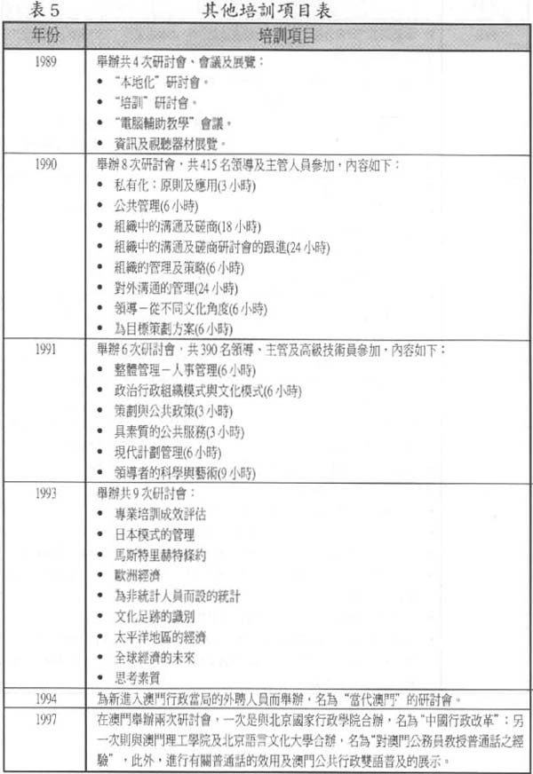 至於其他培訓活動,行政暨公職局在1989年至2000年期間曾舉辦不同類別的研討會、展覧、工作坊和會議,有關活動載於附表5內。