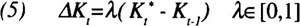 式(3)為Clark(1917)所倡之加速因子理論投資函數,它說明了投資如何因應經濟市道變化而調節。本文選取Koyck(1954)提出較一般化的設定。Koyck的理論重點在導入最適資本水平(K*)的跨期調節式: