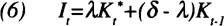 其中△Kt為第t期之資本增量,而1則為調整系數。式(5)說明經濟體系的資本存量調節需時,每年只能以最佳資本水平K*為目標逐步調節。而調節幅度則取決於調整系數值:λ的數值越大調節速度越高,反之亦然。由於投資毛額為資本淨增長及資本耗損重置之和,毛投資支出總額可表為下式: