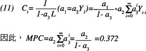 決定乘數效果的其中一個重要參數乃邊際消費傾(MPC)。以延後因子L(lag operator,Yt-1=LY1)重寫式(2),集項後得: