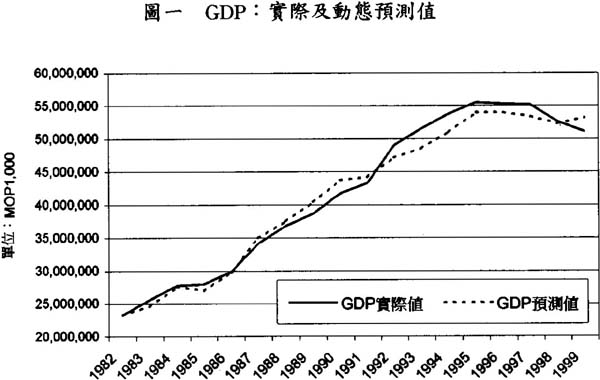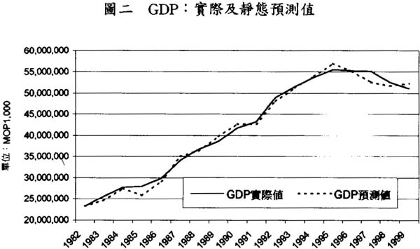 為檢查上述經濟計量模型的預測能力,我們以動態預測方式計算模型的預測值。其中動態預測方法指的是在利用模型產生預測值時,除外生變數外,只使用1982年的內生變數實際值作投入,其餘的落後內生變數均取模型預測值。由圖一可見以較長期的趨勢而言,模型基本上掌握到本地生產總值的變動。1996年以降的經濟衰退亦大致預測到。