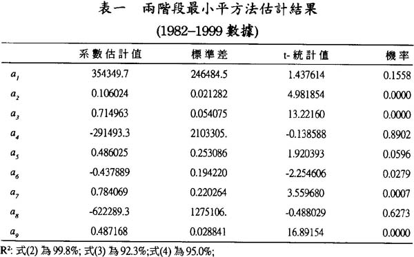 本文提出的澳門經濟計量模型由式(1)-(4)組成。由於需要估計的式(1)-(4)為一動態互動體系,直接以最小平方法(Least Squares Method)估計極有可能踫到聯立方程式問题(simultaneous equation problem),令估計既偏誤又缺一致性。而跟據Monte Carlo法的研究結果,小樣本模型不利於使用更一般化的三階段最小平方法(Three-Stage Least Squares Method),因此我們採用兩階段最小平方法(Two-Stage Least Squares Method)去估計各參數值。在第一階段裡,我們以兩個外生變數及前期決定變數(即前期的內生變數)為regressor估計每一內生變數的縮減式(reduced form);第二階段以縮減式計算的內生變數估計值取代實際值直接估計式(2)-(4)。表一所示為利用1982-1999年固定價格數列(見附錄)及兩階段最小平方法估計之結果。