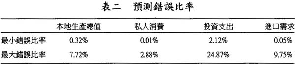 另外,我們以靜態預測的方法推算預測值以檢查其短期預測能力。所謂靜態預測方法指的是在計算當期預測值時,落後內生變數全部使用實際數據。由圖二可見大致上預測可以接受。表二計算預測值的錯誤比率。這個模型的事後預測精確度不差。就整個測試期而言,本地生產總值預測中最大的錯誤比率為7.7%,最小為0.32%。